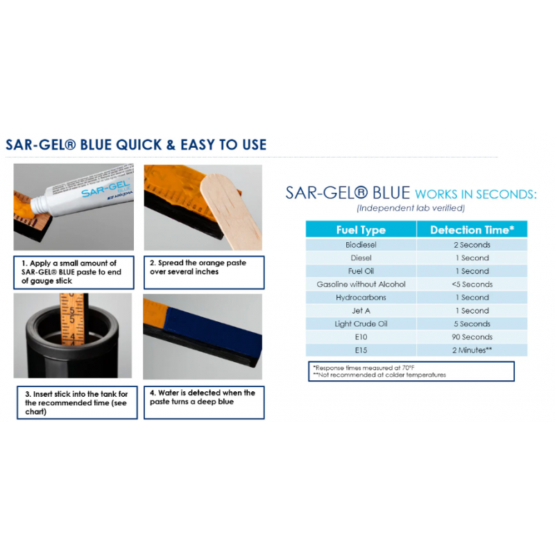 SAR-GEL® BLUE Water Finding Paste provides a fast, reliable way to detect water in the bottom of storage tanks containing diesel, jet fuel, fuel oil, biodiesel, gasoline and gasoline/ethanol blends containing up to 15% ethanol. The orange paste turns blue once it comes into contact with water.